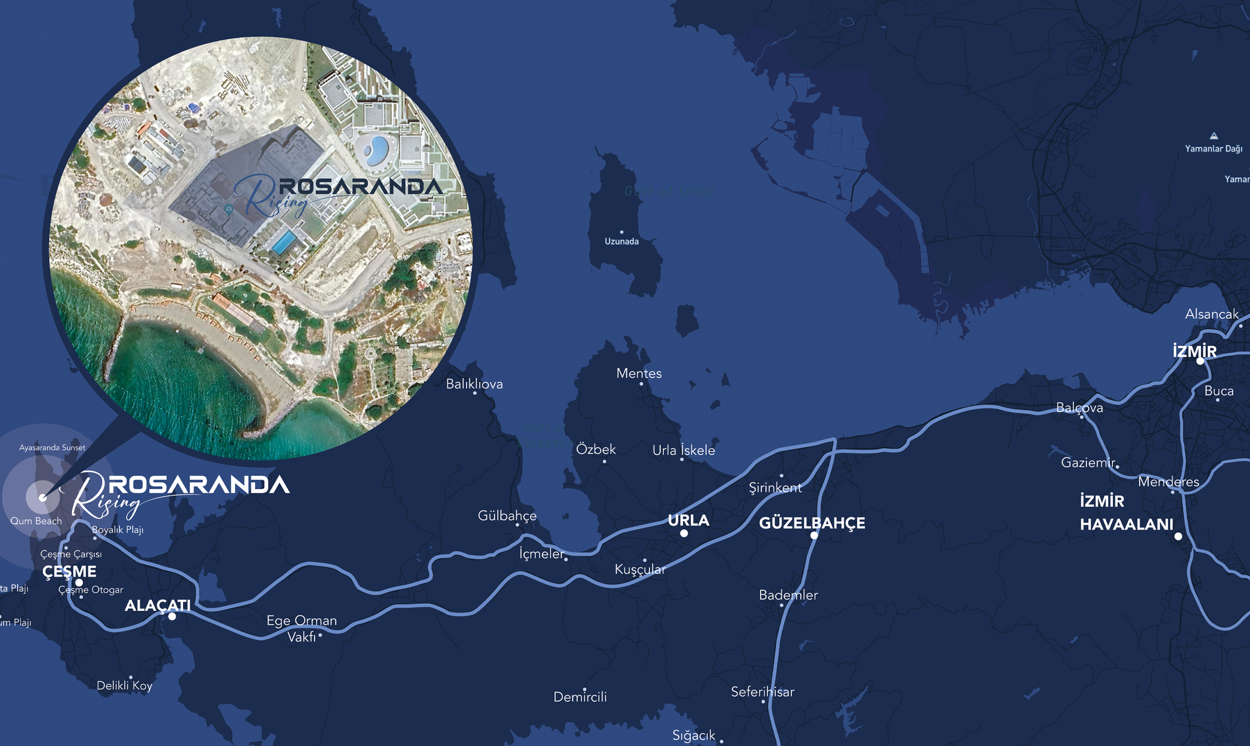 İzmir, Çeşme Ayasaranda’nın tam kalbinde olan projemizin, Çeşme’nin merkeze çok yakın olması, sizler için ayrıcalık sebebidir. Qum Beach - 50 m Ayayorgi Koyu - 1 km Çeşme Merkez - 3 km Çeşme Belediyesi - 4 km Çevre Otogar - 5 km Boyalık Plajı - 8 km Ilıca Plajı - 9 km Alaçatı - 10 km Altınkum Plajı - 11 km Urla - 50 km Güzelbahçe - 60 km İzmir - 88 km İzmir Adnan Menderes Havalimanı 95 km